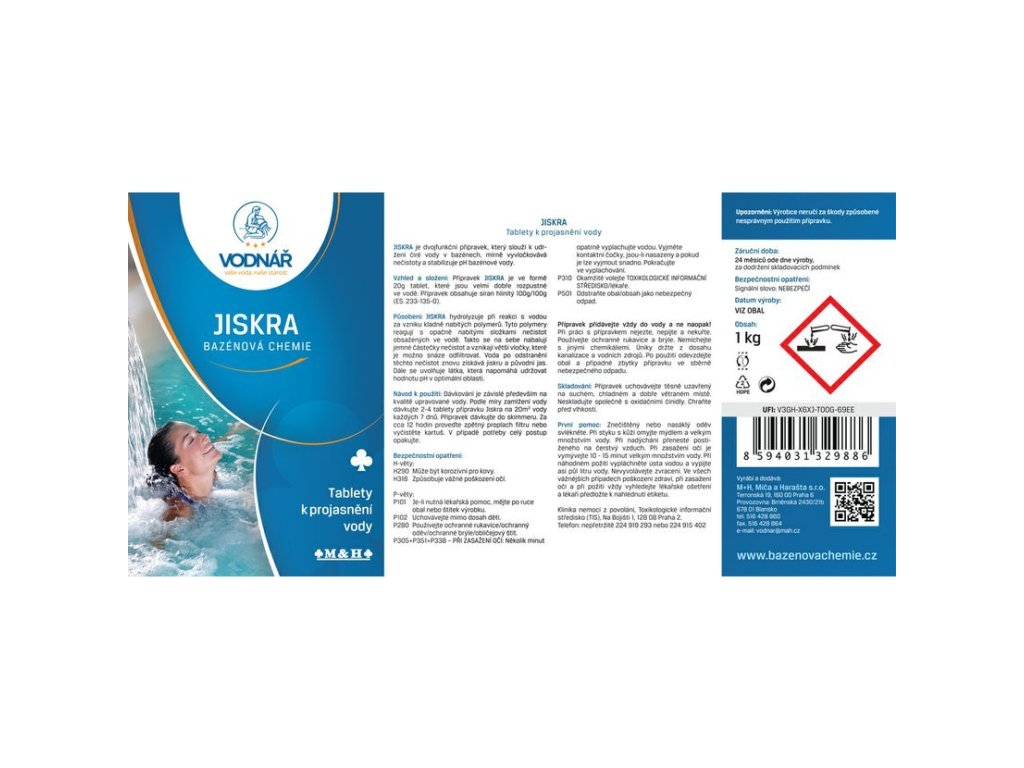- Vodnář Jiskra tablety hydrolyzuje při reakci s vodou za vzniku kladně nabitých polymerů.
